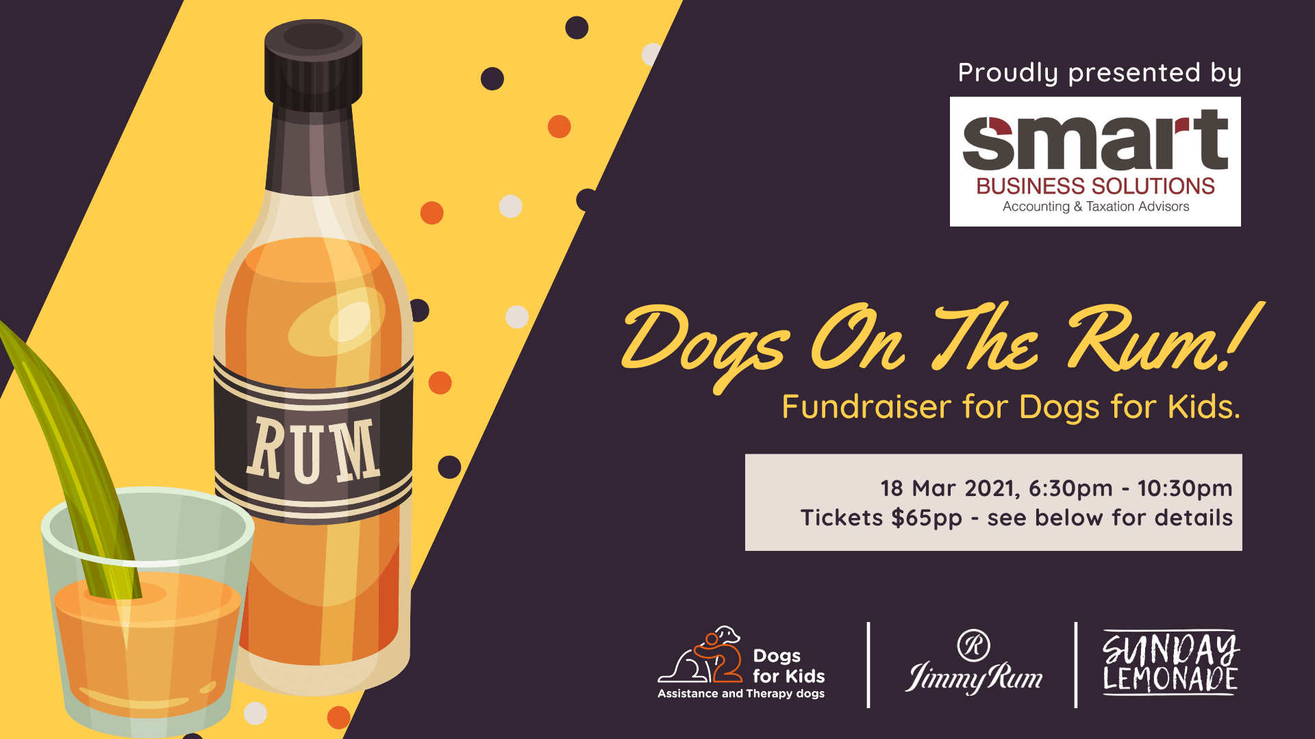 Join us for "Dogs On The Rum", a fun-filled night of rum tastings, an array of mouth-watering nibbles specially created to sate your appetite, live entertainment served up by local duo Sunday Lemonade , fantastic door prizes, giveaways and our online raffle draw, all to riase money for Dogs For Kids.