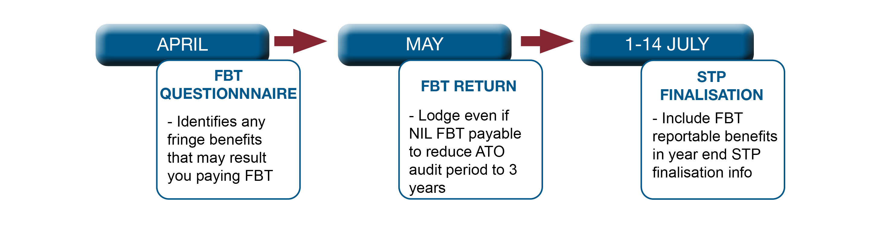 | April | Fringe Benefits Tax (FBT) Return preparation + lodgement |