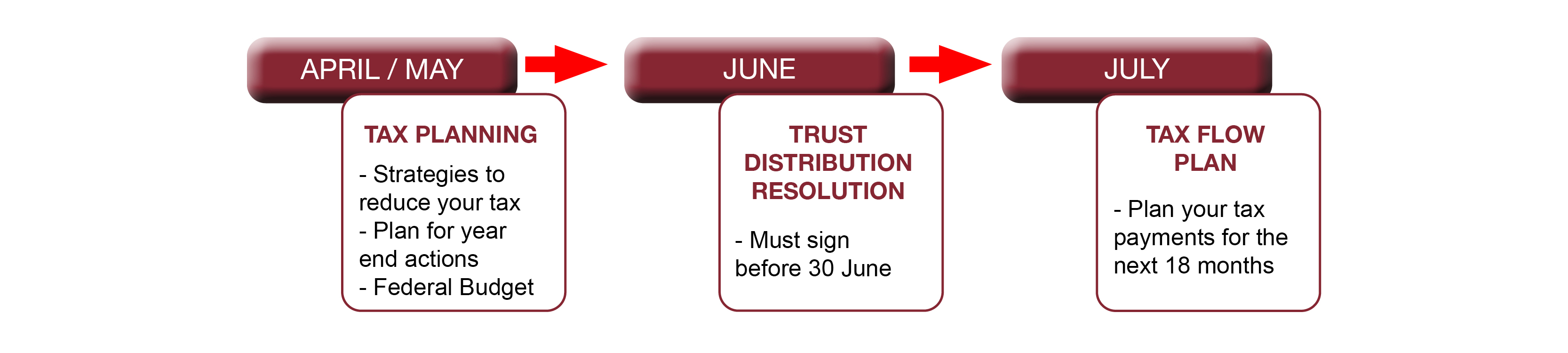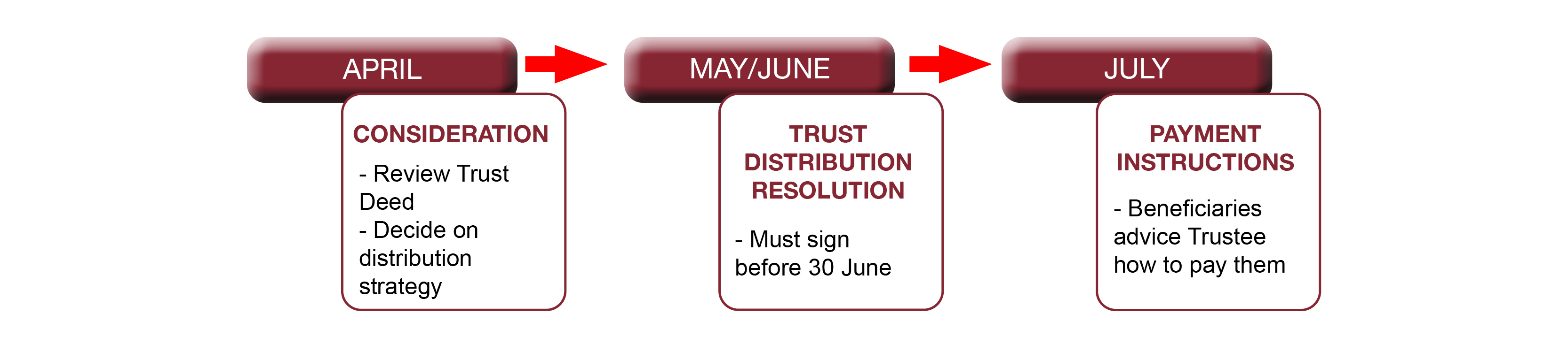 | June | Trust Distribution Resolution preparation + Beneficiary Payment Instructions | - Ensure your Trust is not taxed at 47% on its profits |